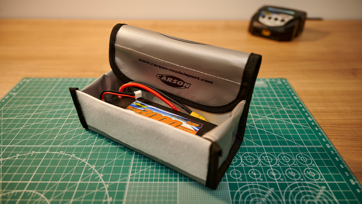 Damit die Sicherheit beim LiPo laden gewährleistet ist, solltest Du die CARSON LiPo-, LiIon- und LiFe-Akkus ausschließlich auf einer feuerfesten Unterlage und in einem CARSON Li-Po “Safe Bag“ aufladen. Platziere das LiPo Ladegerät stets auf hitzebeständigen, nicht-entzündlichen und nicht-leitenden Oberflächen.