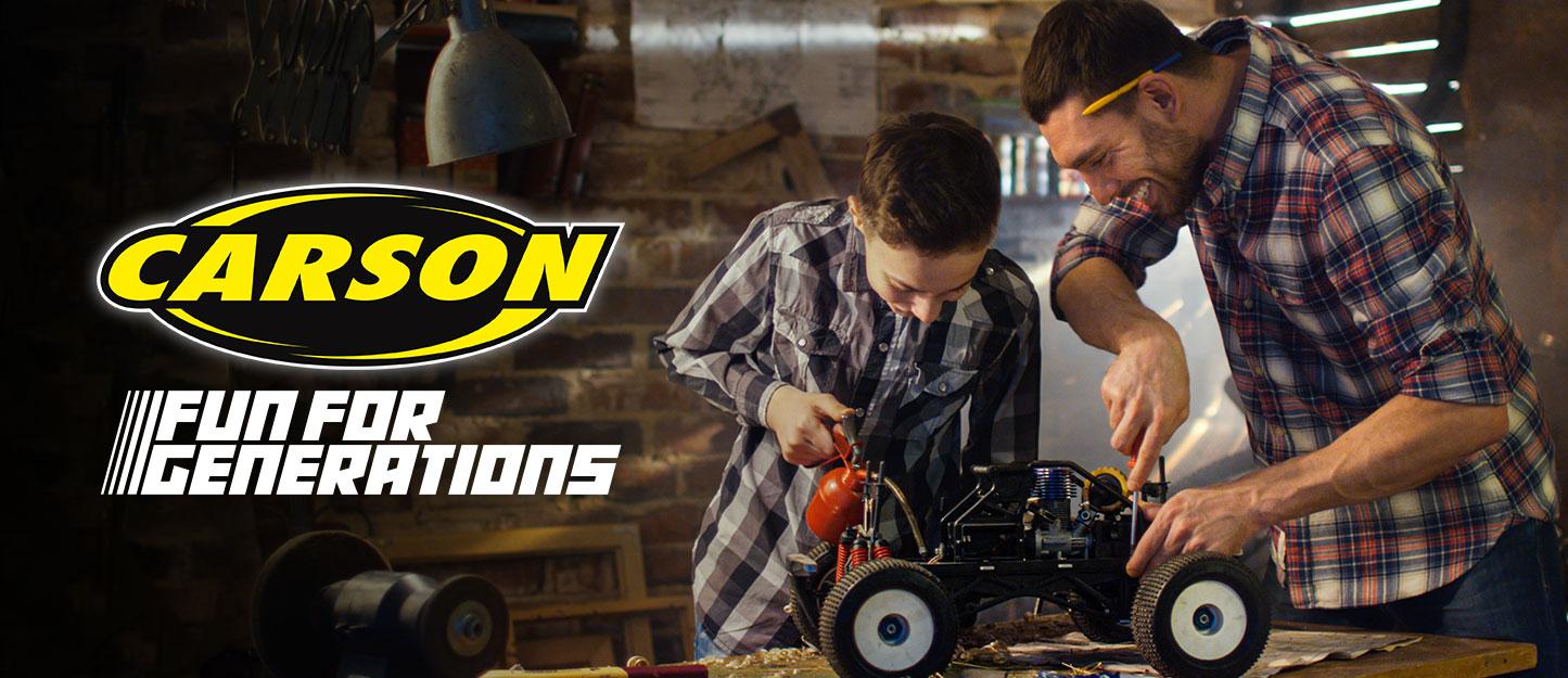 Mit endloser Carson Vielfalt möchten wir RC Fans durch das ganze Leben begleiten: Mit voll ausgestatteten und altersgerechten Modellen führen wir Kinder ab 8 Jahren sowie Einsteiger an die Welt der RC Modelle heran. Erfahrene Modellbauer im Hobby- und Truckbereich unterstützen wir bei ihren Projekten mit High-End-Modellen und einem umfangreichen Ergänzungs-, Ersatz- und Tuningteilsortiment. So soll Carson zu einer aktiven Freizeitgestaltung beitragen, die Generationen im Rahmen Ihres erfüllenden Hobbys verbindet.