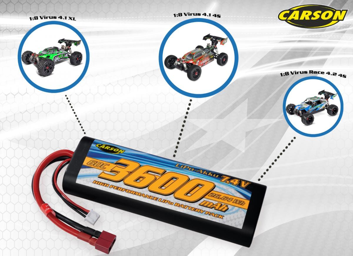 At CARSON you will find various LiPo batteries, but also NiMH batteries and various Li-Ion batteries for your RC vehicles.