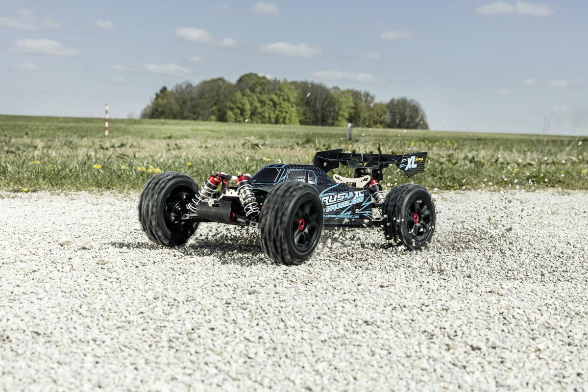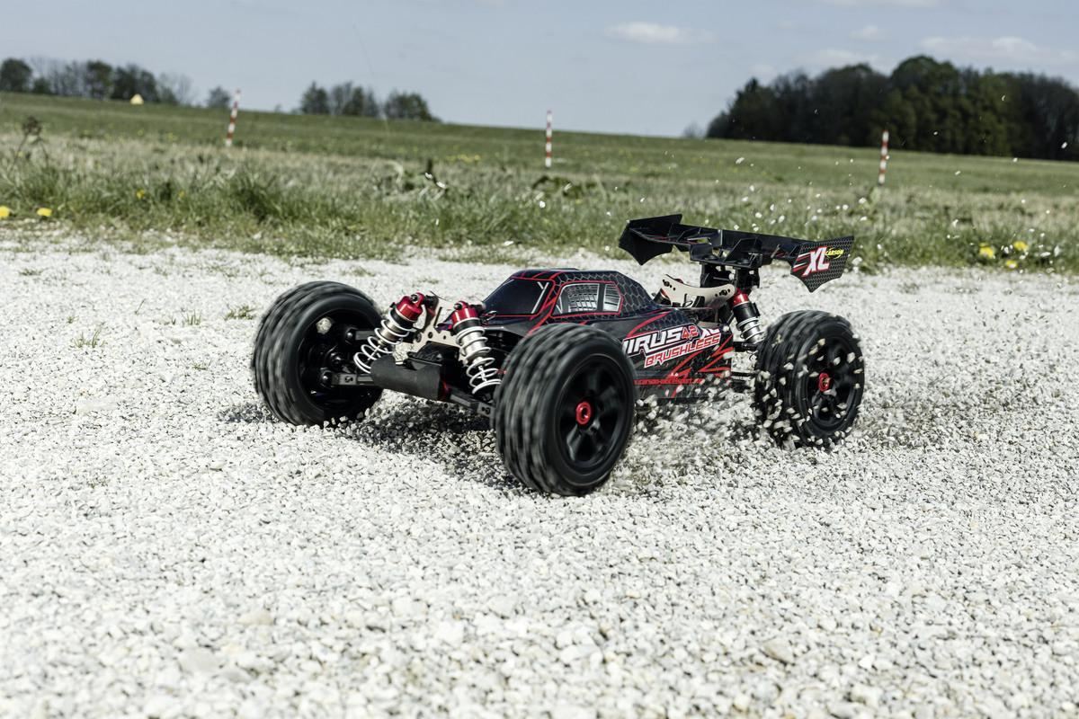 The Virus 4.2 XL relies on a powerful 100 A HOBBYWING 4S brushless set that delivers brute acceleration and high top speeds. Thanks to the interference-free 2.4 GHz remote control system, you have precise control at all times - whether on the track or off-road.