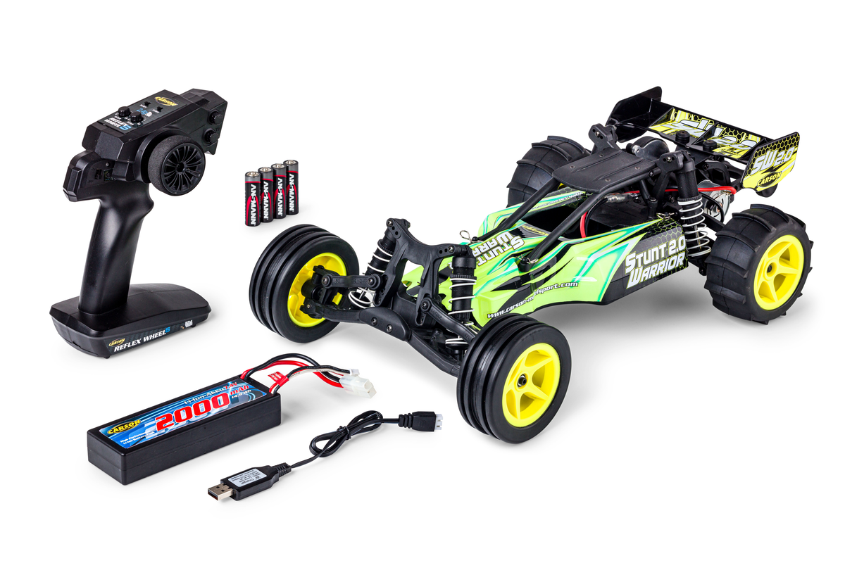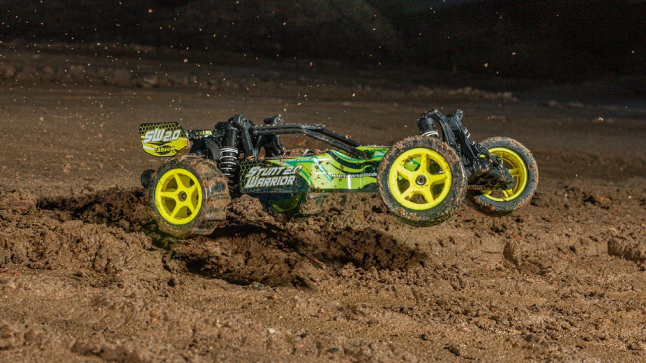 La nouvelle édition du Stunt Warrior 1:10 de CARSON a tout ce dont un vrai buggy RC a besoin : engrenage différentiel, amortisseurs à pression d'huile et un puissant moteur électrique qui accélère le Stunt Warrior jusqu'à 35 km/h.