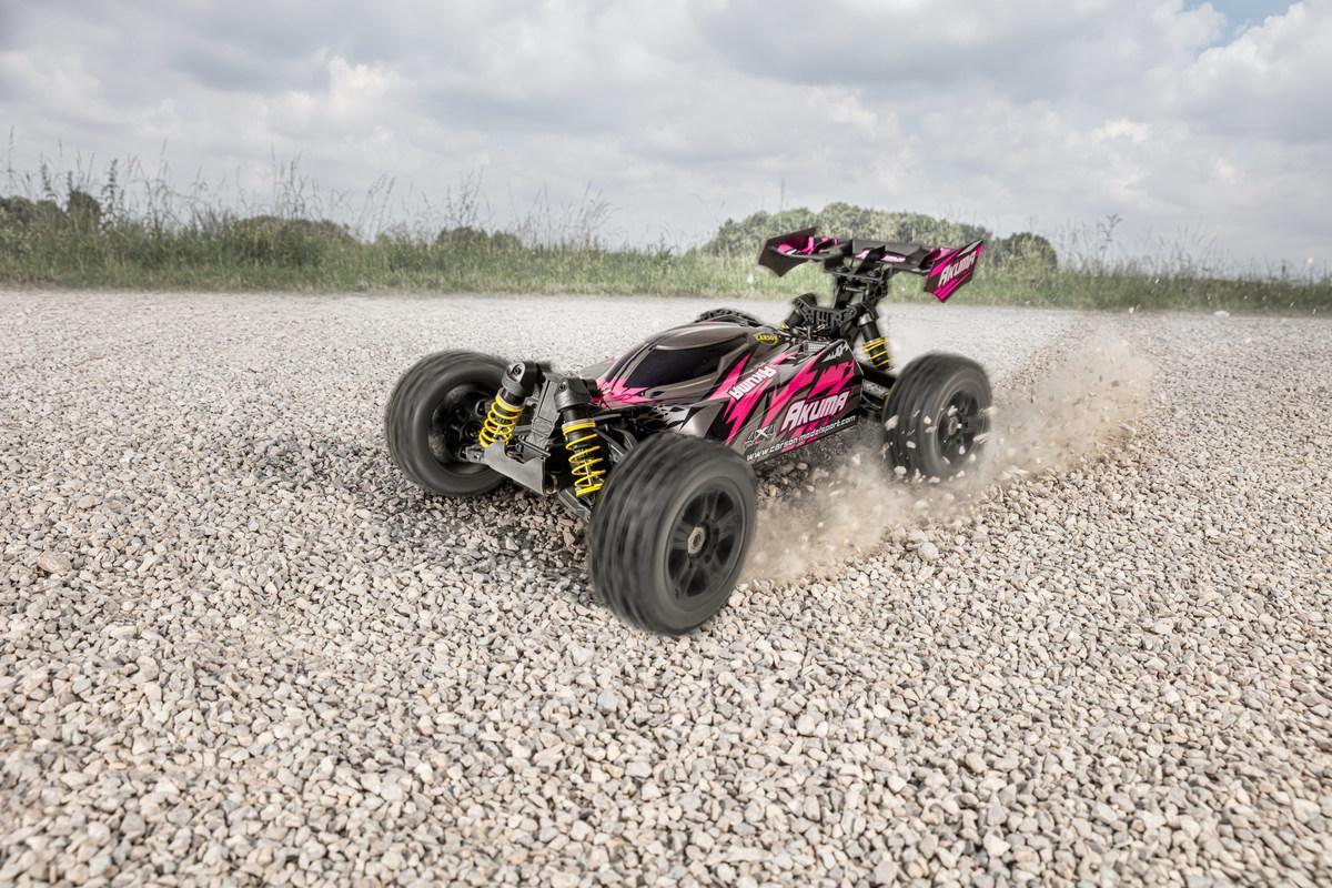 L'Akuma Buggy est un véritable modèle à grande vitesse avec des vitesses allant jusqu'à 70 km/h ! Le moteur de 2000KV, le contrôleur de 100A et le servo de direction de 20 kg garantissent des réactions rapides et une direction précise. Les amortisseurs réglables avec capuchons de protection, la transmission à quatre roues motrices et une plaque d'aluminium stable sur le dessous garantissent des performances optimales.